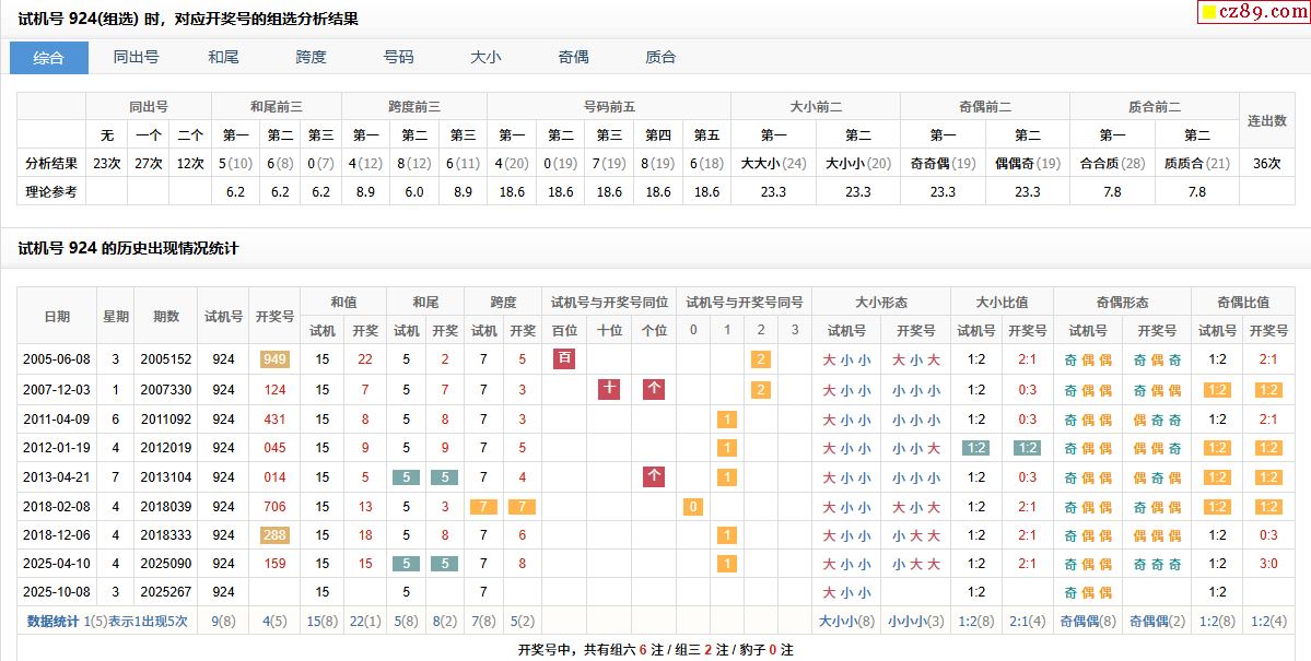 267期福彩3D试机号924对应开奖号的组选分析结果